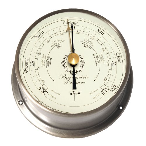 This 2012 Downeaster, Barometer will foretell the weather spectrum from severe storms to dry weather. The Barometer features Mechanical Movements that measure changes in atmospheric/air pressure- rising barometric pressure foretells fair weather, and falling pressure foretells stormy weather on the way. The changes in air pressure mechanically move the measurement on the Dial. Readings of "Stormy"